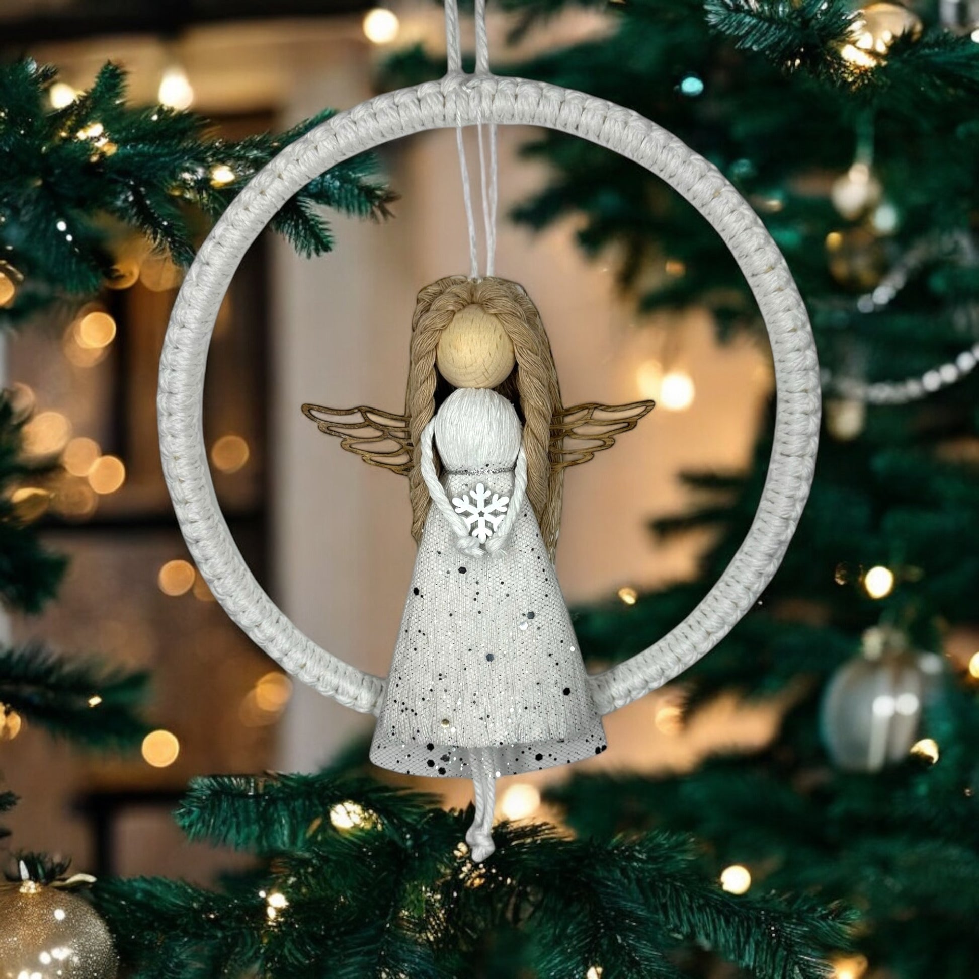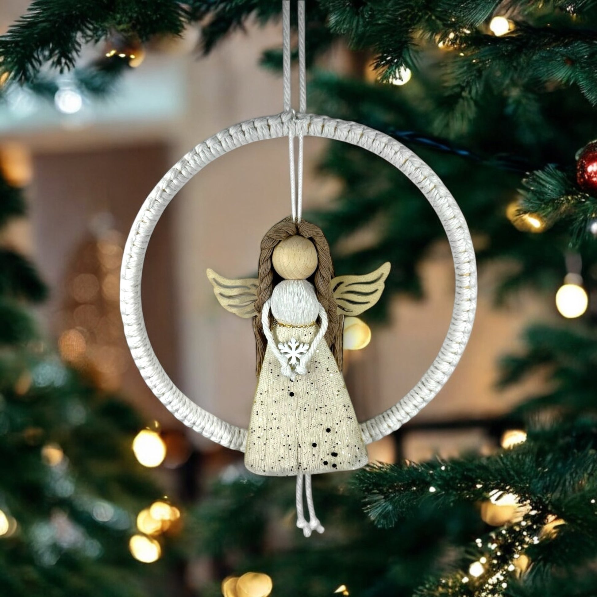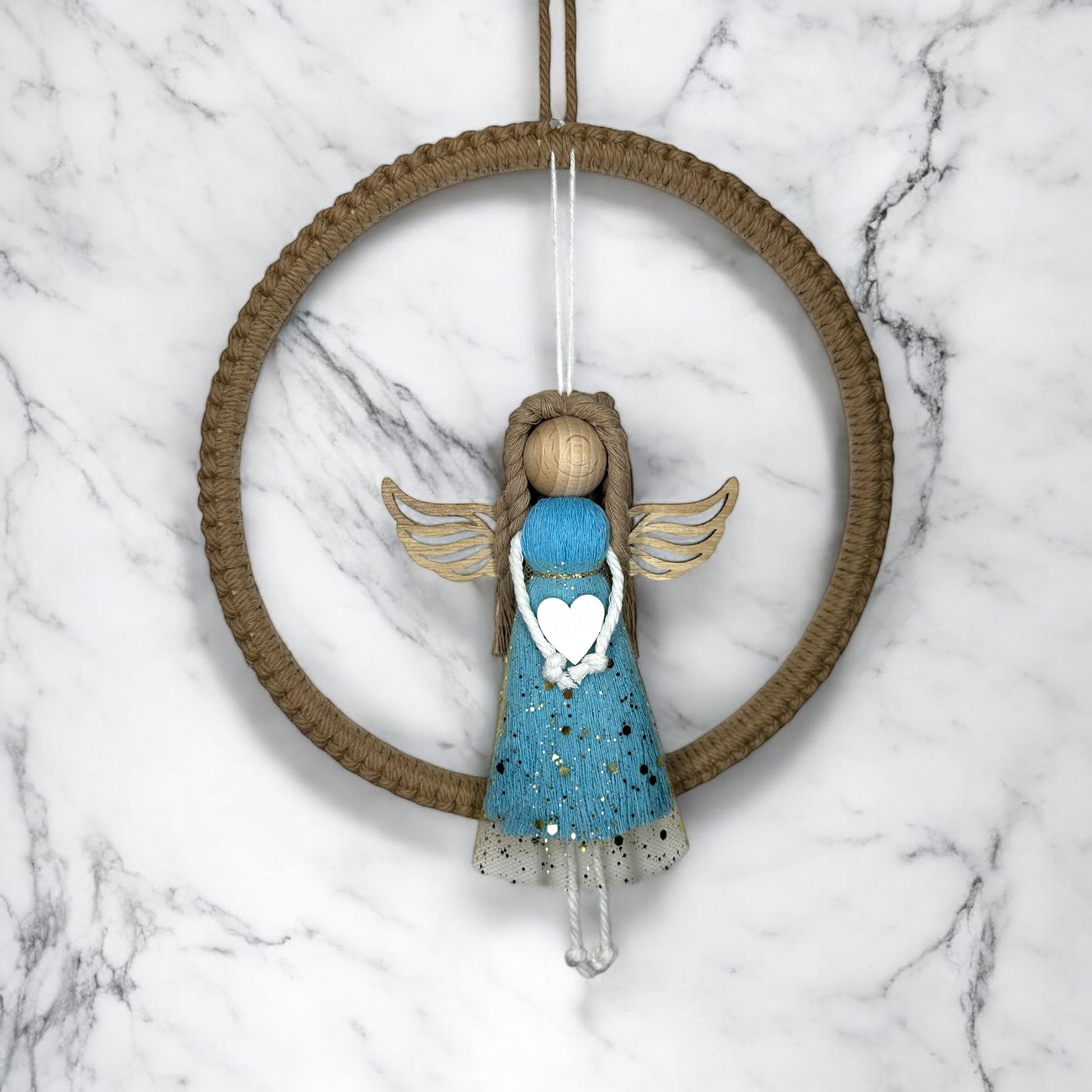 Dieser liebevoll handgefertigter Engel wird ein perfektes Geschenk für Sie oder Ihre Geliebten sein. Der Anhänger ist aus Makramee und einem Holzring.
